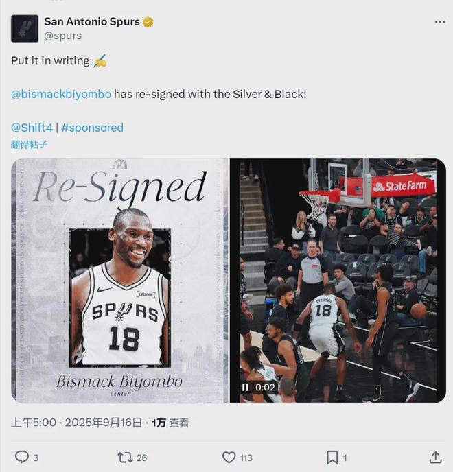 馬刺今天凌晨官宣,他們簽回了替補(bǔ)中鋒比永博。