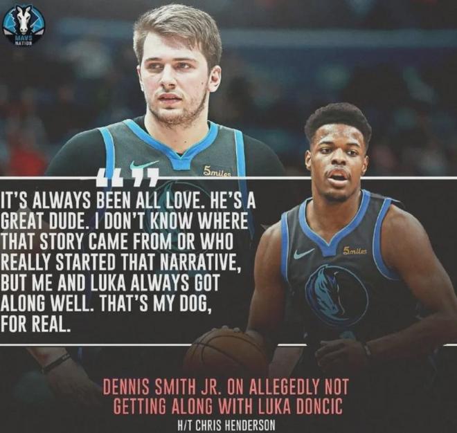 史密斯曾在2019年這么談起東契奇:“我們之間一直充滿著愛,人們試圖創(chuàng)造出這種畫面(兩人關(guān)系緊張)。他是一個非常棒的家伙,我不知道這個故事從何而來,也不知道是誰編造了這個故事。但我和東契奇一直相處地很棒,他是我的兄弟?!?/p>