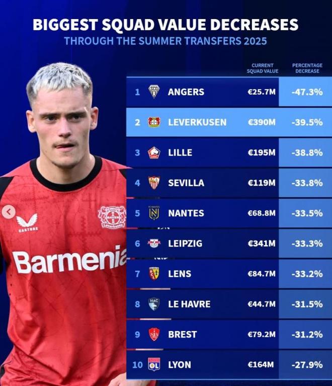 直播吧9月7日訊 《轉(zhuǎn)會市場》統(tǒng)計了今夏轉(zhuǎn)會窗過后的總身價下降比例情況,昂熱居首,法甲7隊在列。