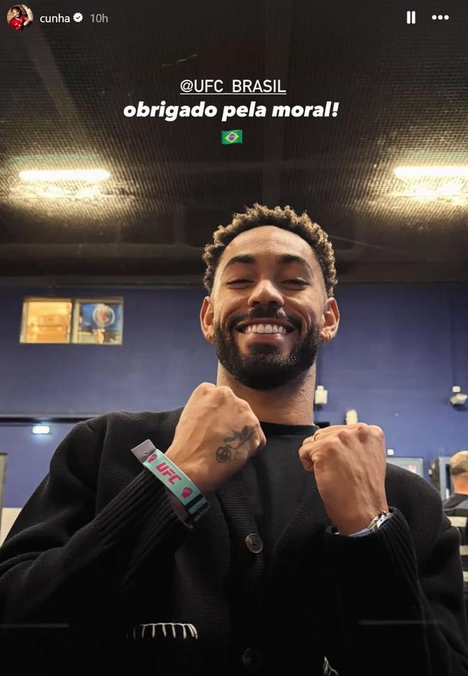 隨后,庫尼亞分享了一張他戴著UFC腕帶擺姿勢的照片,并寫道:“感謝支持(obrigado pela moral)”。
