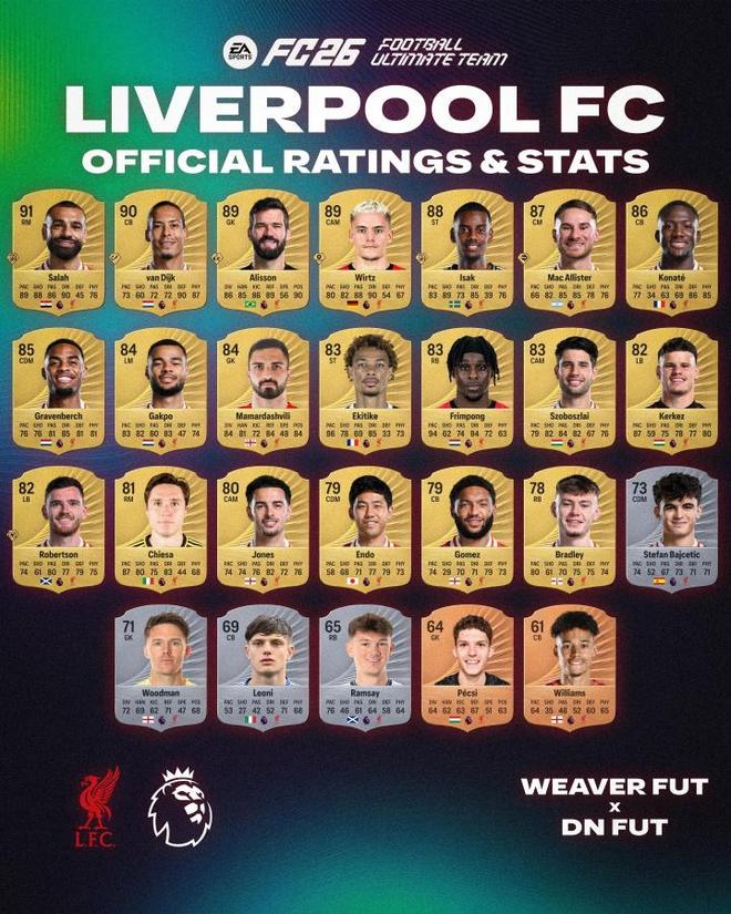 直播吧09月07日訊 足球游戲FC26英超各球隊(duì)球員的評(píng)分曝光,其中薩拉赫以91的評(píng)分領(lǐng)銜全英超,范迪克、羅德里、哈蘭德也獲得了90的評(píng)分。