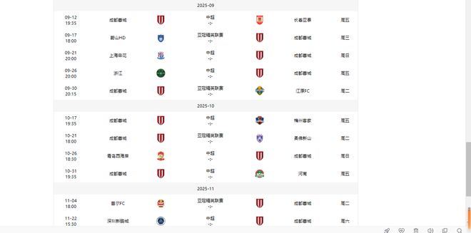 成都蓉城后七輪對手:長春亞泰(主)、上海申花(客)、浙江隊(客)、梅州客家(主)、青島西海岸(客)、河南隊(主)、深圳新鵬城(客)