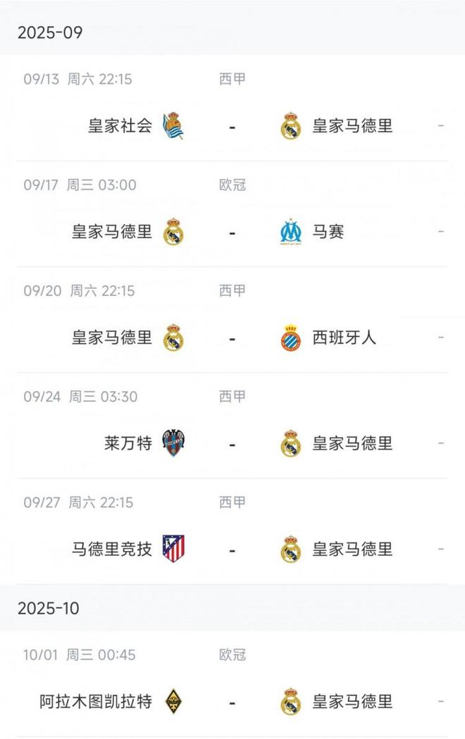 最后兩場則是重頭戲。首先是9月27日的馬德里德比,對手是馬競。隨后皇馬需要遠(yuǎn)征8000公里外的哈薩克斯坦,于10月1日與阿拉木圖凱拉特進(jìn)行歐冠小組賽第2輪的對決。