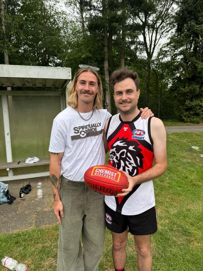 (配圖說明:馬修?卡拉吉奇在漢堡萊茵蘭雄獅澳大利亞式足球俱樂部(Rheinland Lions Australian Football Club e.V)參加澳式足球聯(lián)賽(AFL)賽后,與澳大利亞國腳杰克遜?歐文會面。沒有比這更具澳大利亞特色的場景了?。▓D片來源:作者提供))