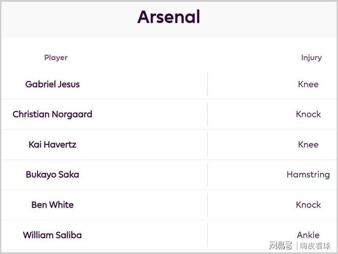 不利的是,阿森納在賽季初期就遇上傷病問題,根據(jù)英超官網(wǎng)的數(shù)據(jù),有6人受傷,包括熱蘇斯、新援諾爾高、哈弗茨、薩卡、懷特和薩利巴。熱蘇斯已經(jīng)長期缺席,薩利巴是最新的,面對利物浦之后受傷。相信醫(yī)療團(tuán)隊已經(jīng)開始承受巨大的壓力,盡管引入了多名新援,也不能如此“嚯嚯”啊。