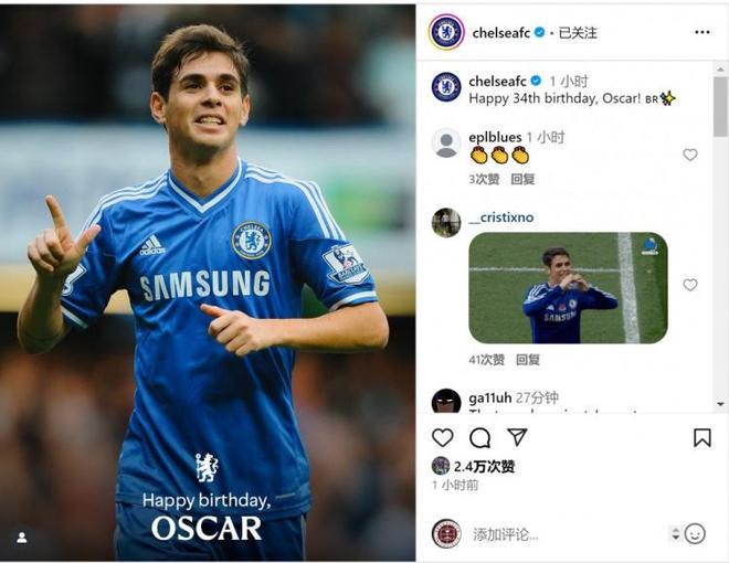 切爾西官方社媒曬出奧斯卡效力球隊時期的照片,配文:“祝奧斯卡34歲生日快樂!”
