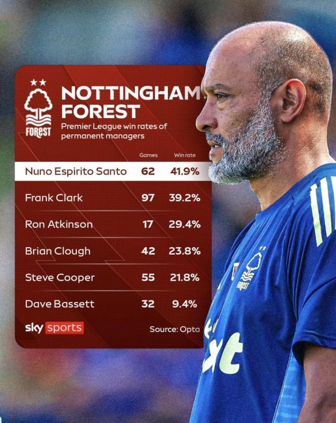 努諾手下的諾丁漢森林英超勝率41.9%,是隊史勝率最高的主帥