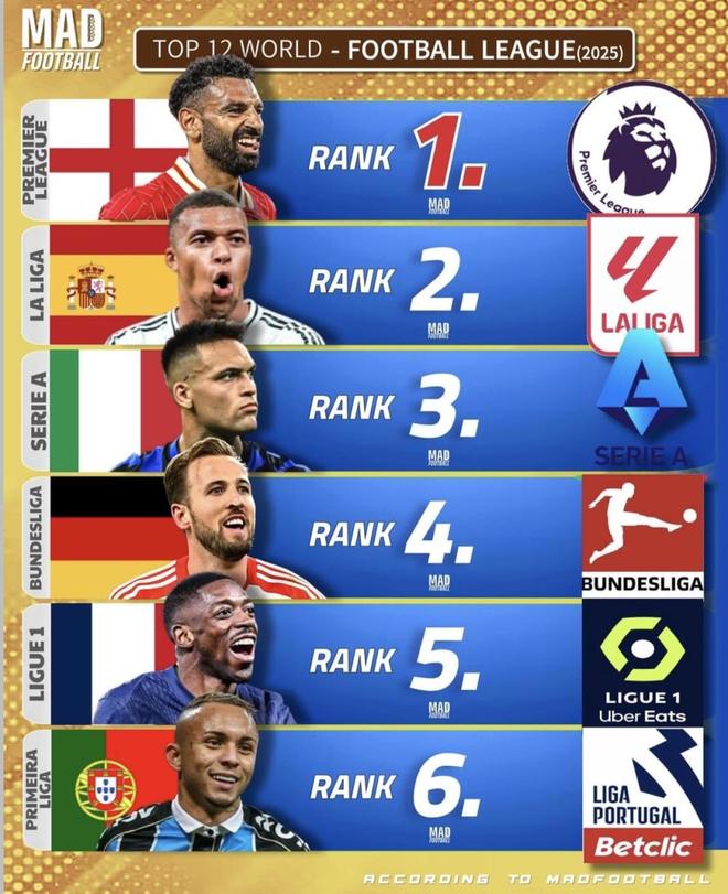 前四名(英超、西甲、意甲、德甲)無爭議,法甲/葡超/荷甲/巴甲的排序大體合理。