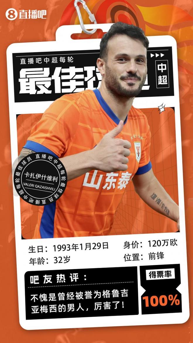 再次感謝卡扎伊什維利和山東泰山足球俱樂部對于直播吧中超每輪最佳球員評選活動的大力支持。