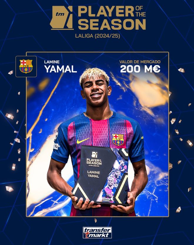 雷速體育9月11日訊 巴塞羅那足球俱樂(lè)部邊鋒拉明·亞馬爾榮獲2024/25賽季西甲聯(lián)賽賽季最佳球員獎(jiǎng)杯,該獎(jiǎng)項(xiàng)由德轉(zhuǎn)(Transfermarkt)社區(qū)在賽季末評(píng)選頒發(fā)。