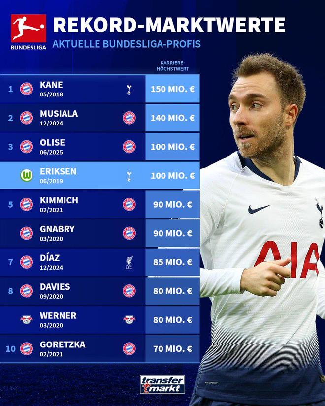 早些時候,沃爾夫斯堡宣布簽下埃里克森,根據(jù)德國轉(zhuǎn)會市場的統(tǒng)計數(shù)據(jù),埃里克森的歷史最高身價為1億歐元,而德甲聯(lián)賽當中只有兩名球員的歷史身價比他高。