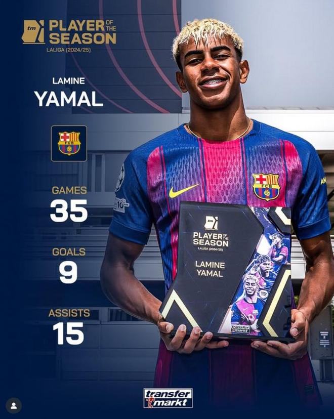 35場(chǎng)9球15助攻!德轉(zhuǎn)官方:18歲巴薩邊鋒亞馬爾獲評(píng)上賽季西甲MVP
