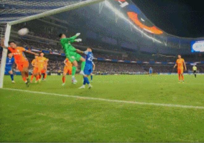 王大雷只能眼睜睜地看著皮球直接鉆入網(wǎng)窩。汪海健做出攤手的慶祝動作。起身后,王大雷立刻向主裁抗議,并做出咬手指的動作。但是,麥麥提江不為所動,堅持認為申花進球有效。