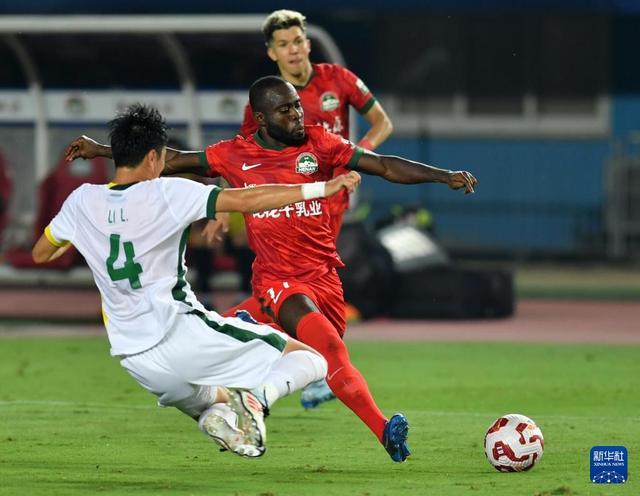 9月12日,河南俱樂部酒祖杜康隊(duì)球員阿奇姆彭(前右)與北京國安隊(duì)球員李磊(前左)在比賽中拼搶。新華社記者 李嘉南 攝
