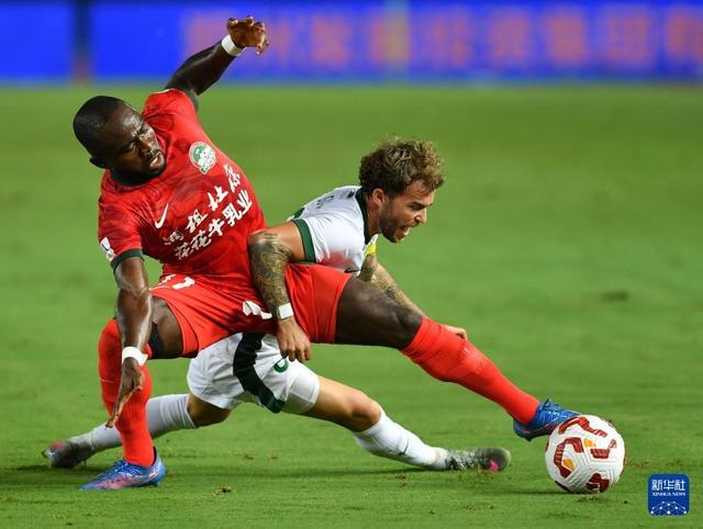 9月12日,河南俱樂部酒祖杜康隊(duì)球員阿奇姆彭(左)與北京國安隊(duì)球員貢薩洛在比賽中拼搶。新華社記者 李嘉南 攝