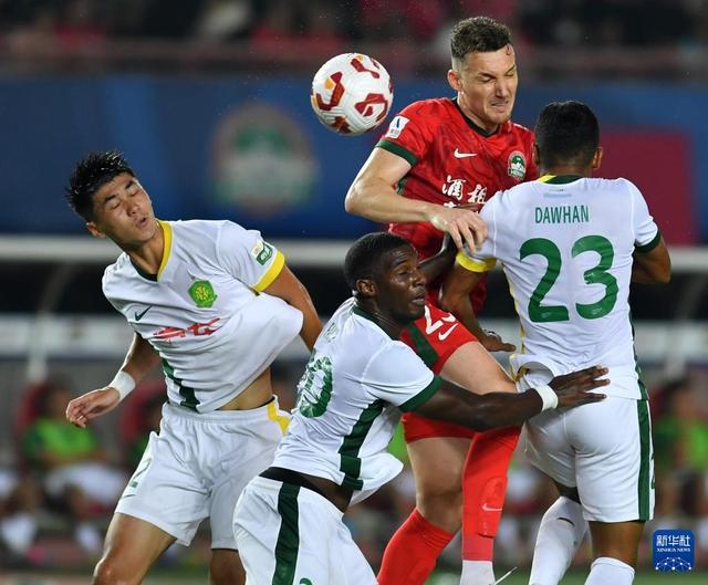 9月12日,河南俱樂部酒祖杜康隊(duì)球員盧卡斯·馬亞(右二)在比賽中爭頂。新華社記者 李嘉南 攝
