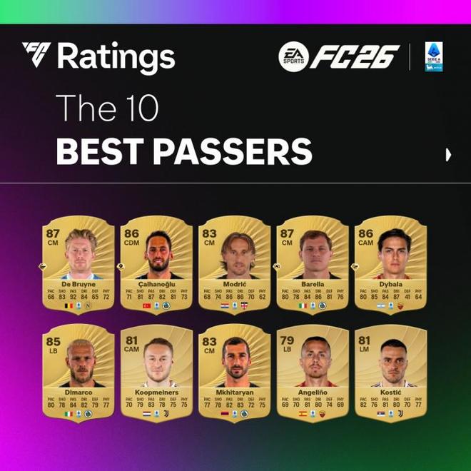 FC26意甲球員傳球top10:德布勞內(nèi)92居首,恰20、莫德里奇二三位