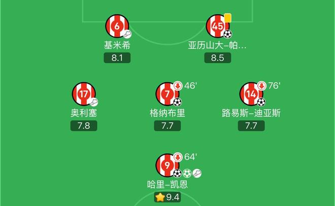 其中凱恩貢獻2球1助,格納布里、帕夫洛維奇和路易斯-迪亞斯各入一球,基米希和奧利塞則各送出1次助攻。