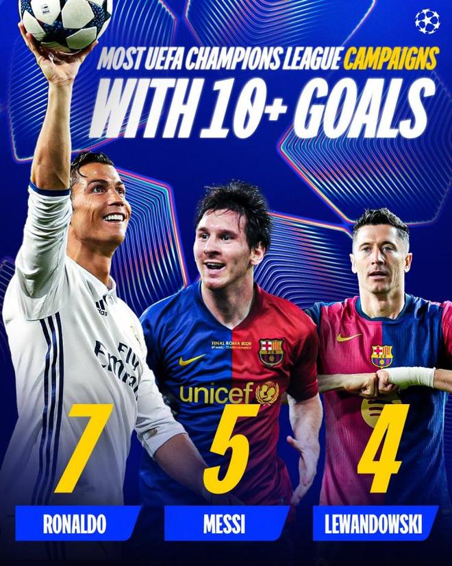 歐冠官方社媒曬出球員單賽季歐冠進(jìn)球10+的次數(shù),C羅7次、梅西5次、萊萬4次,配文:“萊萬本賽季會(huì)追平梅西嗎?”