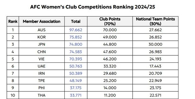 與此同時,中國女足的積分,也沒有領先。亞冠技術(shù)分方面,她們落后澳大利亞、韓國和日本,排名第四。