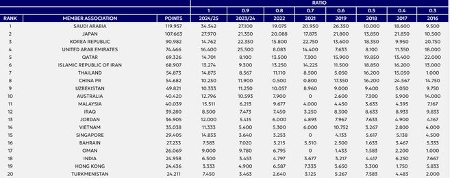 亞足聯(lián)公布了最新的男足技術(shù)分,沙特、日本、韓國、阿聯(lián)酋、卡塔爾、伊朗排名前六。其中沙特領先優(yōu)勢比較大,東亞前二日韓領先第三的泰國也比較多。
