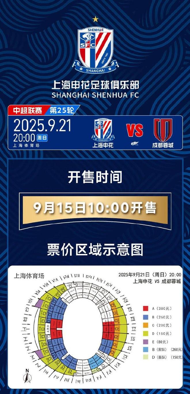 官方消息,上海申花vs成都蓉城的門票將于9月15日上午10點(diǎn)開售。