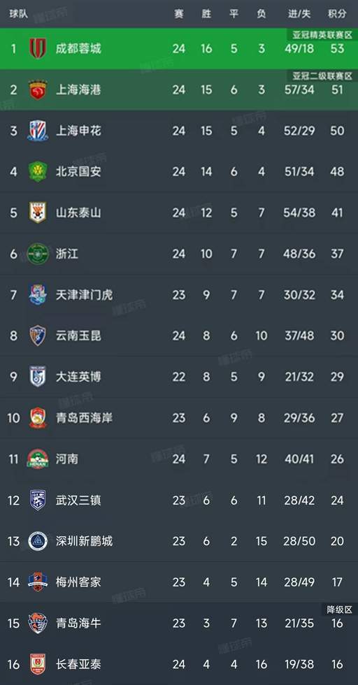 隨著浙江20青島西海岸,中超第24輪最新積分榜如下,前三差3分