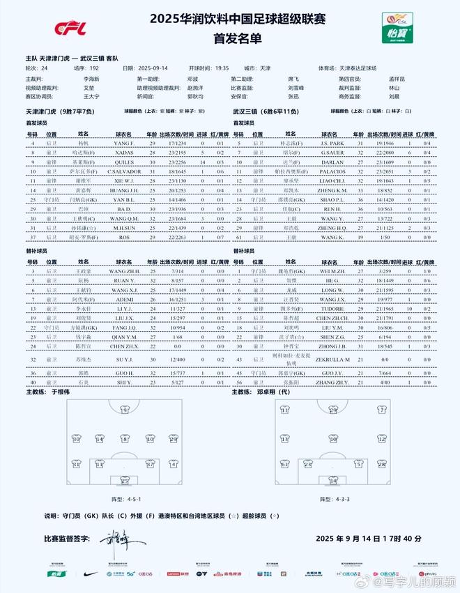 北京時(shí)間9月14日19:35,中超聯(lián)賽第24輪,天津津門虎坐鎮(zhèn)主場(chǎng)迎戰(zhàn)武漢三鎮(zhèn),本場(chǎng)比賽主裁判是李海新,VAR是艾堃,賽前雙方公布首發(fā):