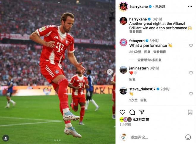 凱恩社媒寫道:又一個在安聯(lián)球場的美妙之夜!精彩的勝利和頂級的表現(xiàn)