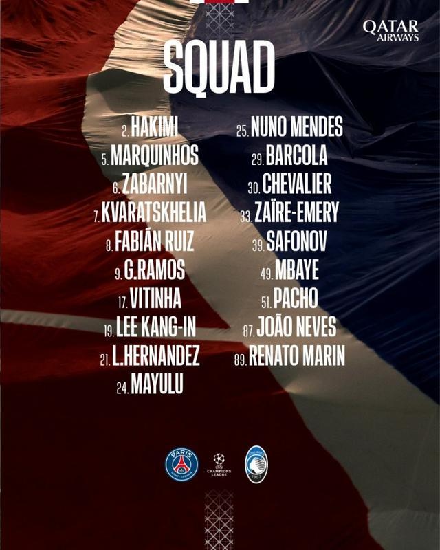 巴黎歐冠大名單:2-阿什拉夫、5-馬爾基尼奧斯、6-扎巴爾尼、7-克瓦拉茨赫利亞、8-法比安-魯伊斯、9-貢薩洛-拉莫斯、17-維蒂尼亞、18-李剛?cè)省?1-盧卡斯-埃爾南德斯、24-馬尤盧、25-努諾-門德斯、29-巴爾科拉、30-舍瓦利耶、33-小埃梅里、39-薩福諾夫、49-姆巴耶、51-帕喬、87-若昂-內(nèi)維斯、89-馬林