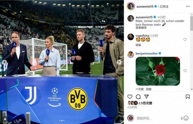 胡梅爾斯現(xiàn)場(chǎng)評(píng)述尤文vs多特,社媒曬照調(diào)侃:我不再是退休人士了