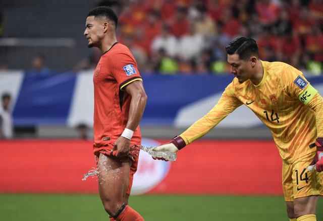 2025年6月10日,中國隊守門員王大雷(右)和隊友蔣光太在比賽間隙。 當(dāng)日,在重慶舉行的2026年美加墨世界杯亞洲區(qū)預(yù)選賽18強(qiáng)賽C組第十輪比賽中,中國隊主場1比0戰(zhàn)勝巴林隊。 新華社記者 陳誠 攝