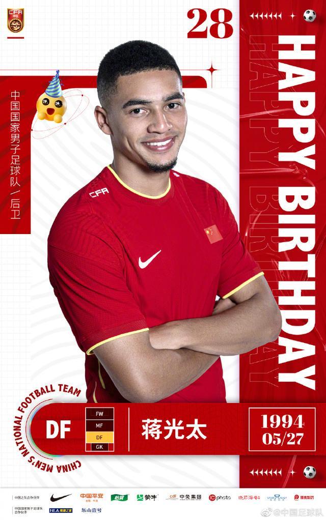 今年5月27日,中國足球隊官方微博發(fā)布了對國腳球員蔣光太的生日祝福:場上,你身體強(qiáng)壯、擅長對抗;場下,你低調(diào)內(nèi)斂、笑容靦腆。27歲“反差萌”大男孩兒蔣光太生日快樂!四十強(qiáng)賽即將重燃戰(zhàn)火,愿你成為國足后場定海神針!蔣光太出生于1994年5月27日,他出生于英國利物浦,祖籍廣東江門,母親是華裔。2019年初,蔣光太加盟中超廣州恒大淘寶,隨后完成了入籍手續(xù),成為了中國國腳。