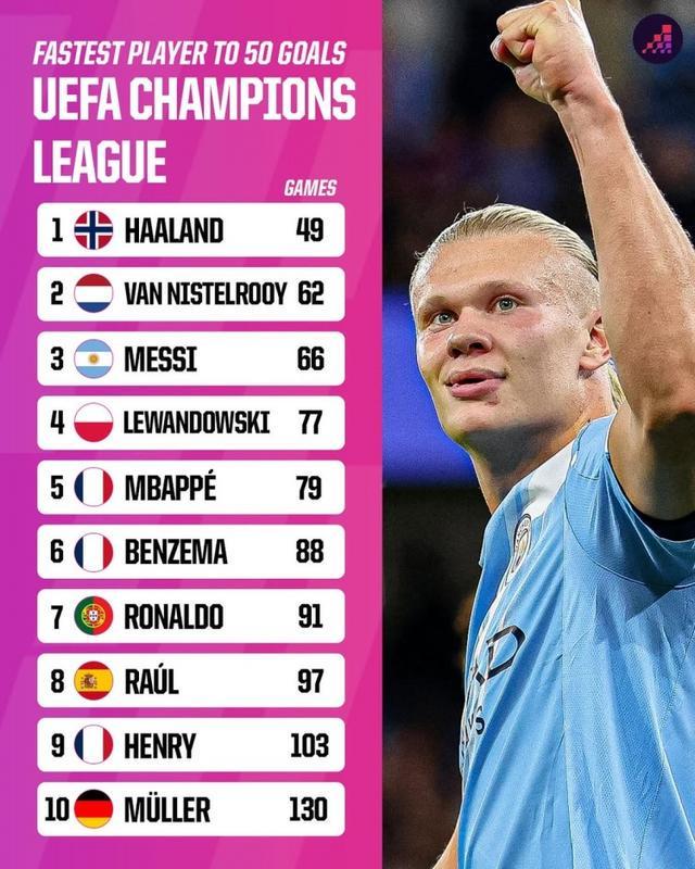 歐冠50球最快達(dá)成:哈蘭德49場(chǎng)居首,梅西66場(chǎng)第2,C羅91場(chǎng)第7