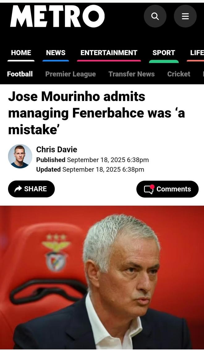 英國《地鐵報(bào)》(Metro)則以《穆里尼奧:執(zhí)教費(fèi)內(nèi)巴切是一個(gè)錯(cuò)誤》為標(biāo)題,報(bào)道了穆里尼奧對老東家的不滿,他在新聞發(fā)布會(huì)上表示:"我做了錯(cuò)誤的選擇,但我并不后悔,我不該去費(fèi)內(nèi)巴切執(zhí)教的,那里的足球文化和我想象的不同,我一直在盡我最大的努力,但沒有成功,現(xiàn)在我來到了本菲卡,這是世界上最好的俱樂部之一,這里更適合我。"