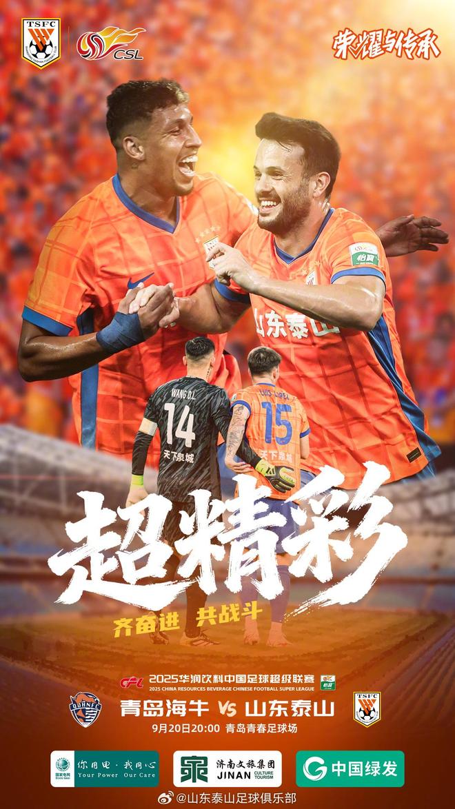 雷速體育9月19日訊 山東泰山將在明日晚間20:00的中超“齊魯?shù)卤取敝凶隹蛯﹃嚽鄭u海牛,賽前俱樂部官方發(fā)布了本場比賽的預(yù)熱海報(bào),主題為“超精彩”。