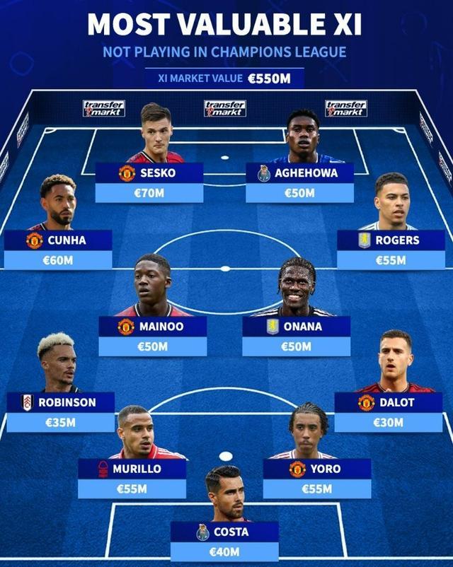直播吧9月19日訊 本賽季歐冠已經(jīng)拉開帷幕,德轉(zhuǎn)也盤點了無緣本賽季歐冠的最貴陣容,其中曼聯(lián)5人在列,具體如下: