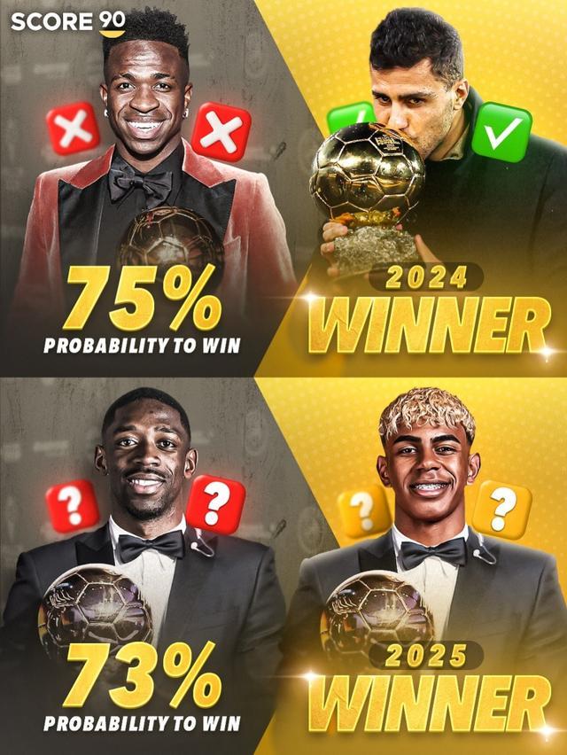 今年會(huì)重演嗎去年維尼修斯金球75%概率被翻,今年登貝萊概率73%