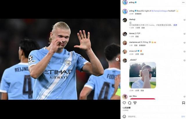 哈蘭德社媒曬“50粒進(jìn)球”手勢,配文:美妙的歐冠之夜!
