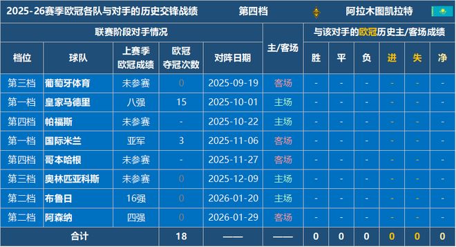 阿拉木圖凱拉特(哈薩克斯坦):2015-16賽季,阿斯坦納,以0勝4平2負(fù)小組賽墊底;