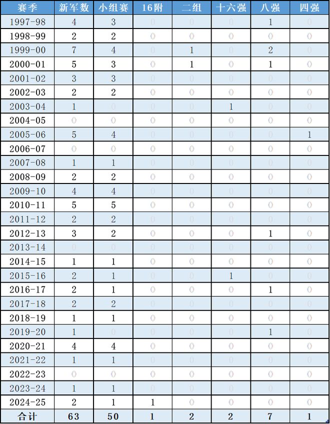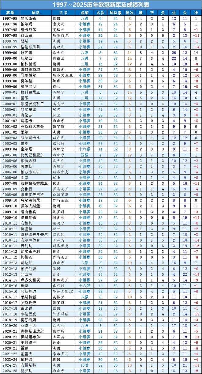 附:1997-2025年歐冠新軍及成績(jī)列表