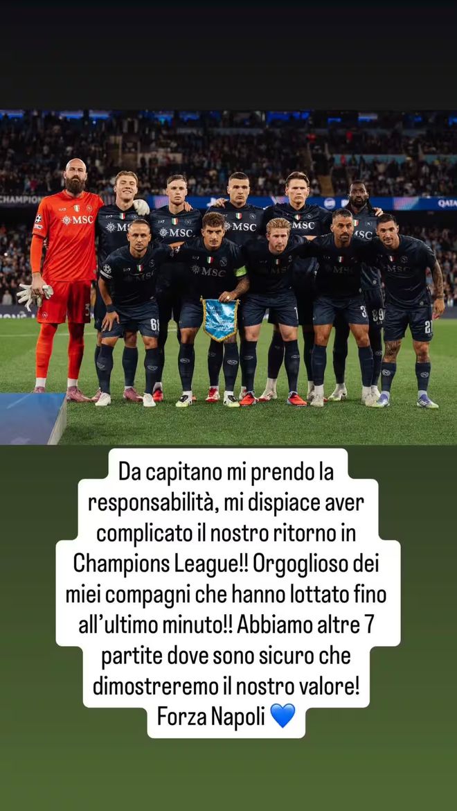 迪洛倫佐寫到:作為隊長,我該承擔(dān)責(zé)任。很抱歉,我讓我們的歐冠之旅變得困難,但我為我的隊友們戰(zhàn)斗到了最后一刻感到驕傲。我們還有七場比賽,我相信我們會證明自己的價值。那不勒斯加油!