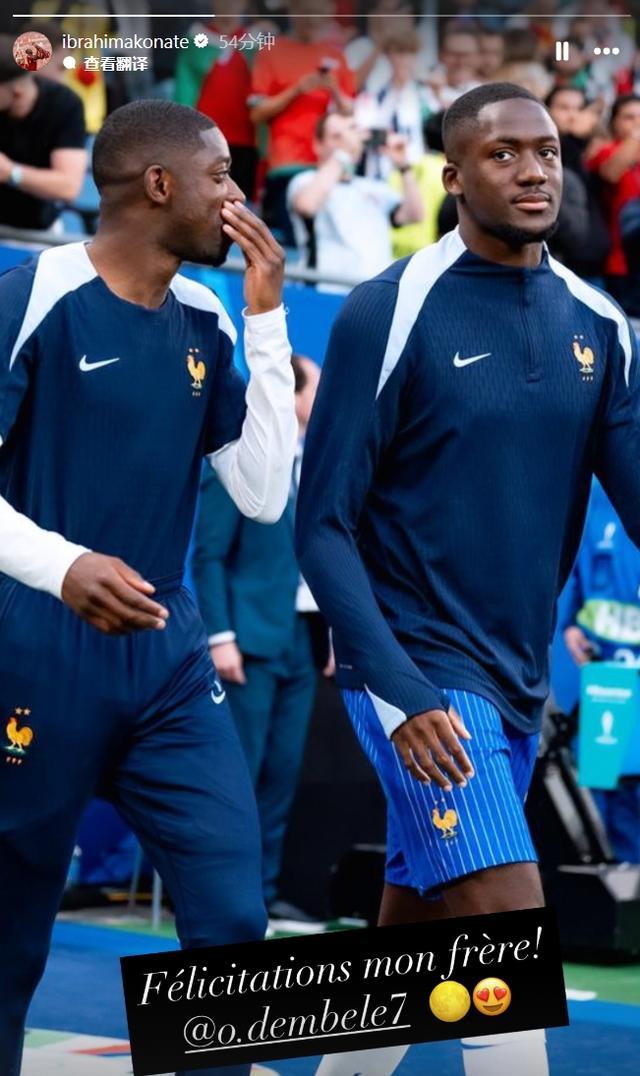 科納特曬出了自己與登貝萊在國家隊的合照,配文寫道:“祝賀你,我的兄弟!”