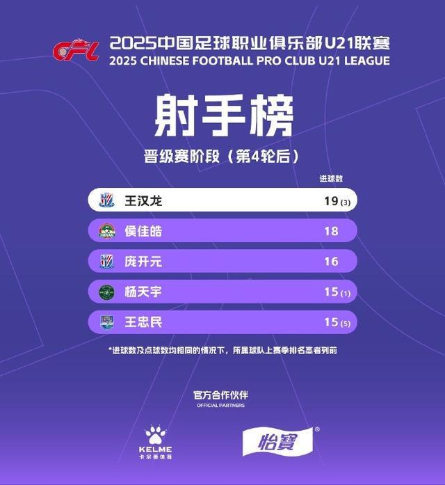 射手榜方面,上海申花U21球員王漢龍以19粒進球排名第一,浙江隊U21球員侯佳皓以18球排名第二。