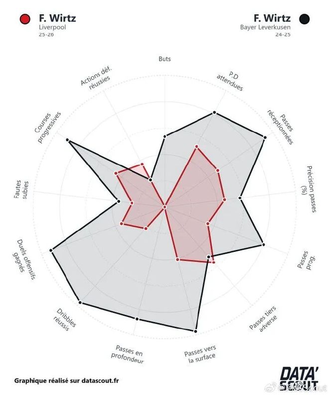 這張雷達圖對比了維爾茨在勒沃庫森(24/25)與利物浦(25/26)的數(shù)據(jù)表現(xiàn)。