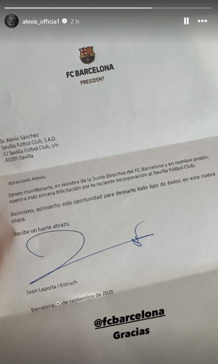 這位智利前鋒曾在2011-12至2013-14賽季為巴薩效力,共計(jì)出場(chǎng)141次,打入41球,在由拉波爾塔簽名的信中,俱樂(lè)部祝愿他在轉(zhuǎn)會(huì)塞維利亞后取得成功。
