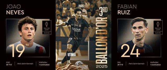 而上賽季為巴黎奪冠立下汗馬功勞的中場3人,也都入圍提名,維蒂尼亞排名第3、若奧-內維斯排名第19、法比安-路易斯排名第24。組建這條中場卻只花費了巴黎1.23億歐。