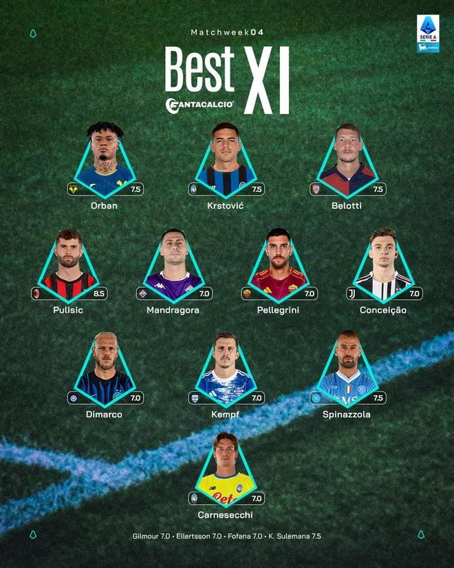 意甲第4輪最佳陣容:普利希奇、小孔塞桑、迪馬爾科入選