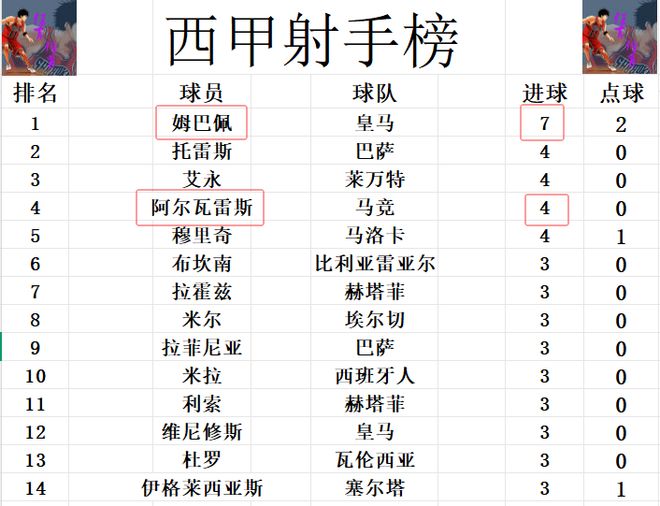 射手榜方面,姆巴佩6輪7球繼續(xù)領(lǐng)跑,阿爾瓦雷斯今天上演帽子戲法后,追上托雷斯,艾永,穆里奇等人4球并列第2。拉菲尼亞,維尼修斯,杜羅,伊格萊西亞斯等人3球擠入前十。