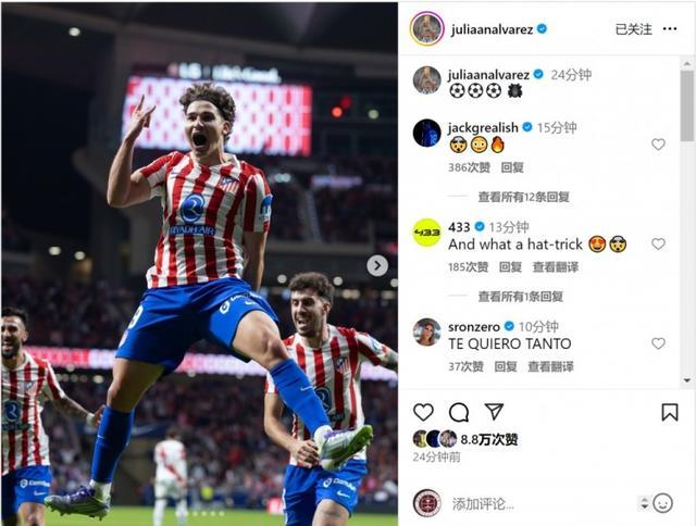 阿爾瓦雷斯社媒曬出比賽照片,慶祝球隊取勝+戴帽,配文:???????